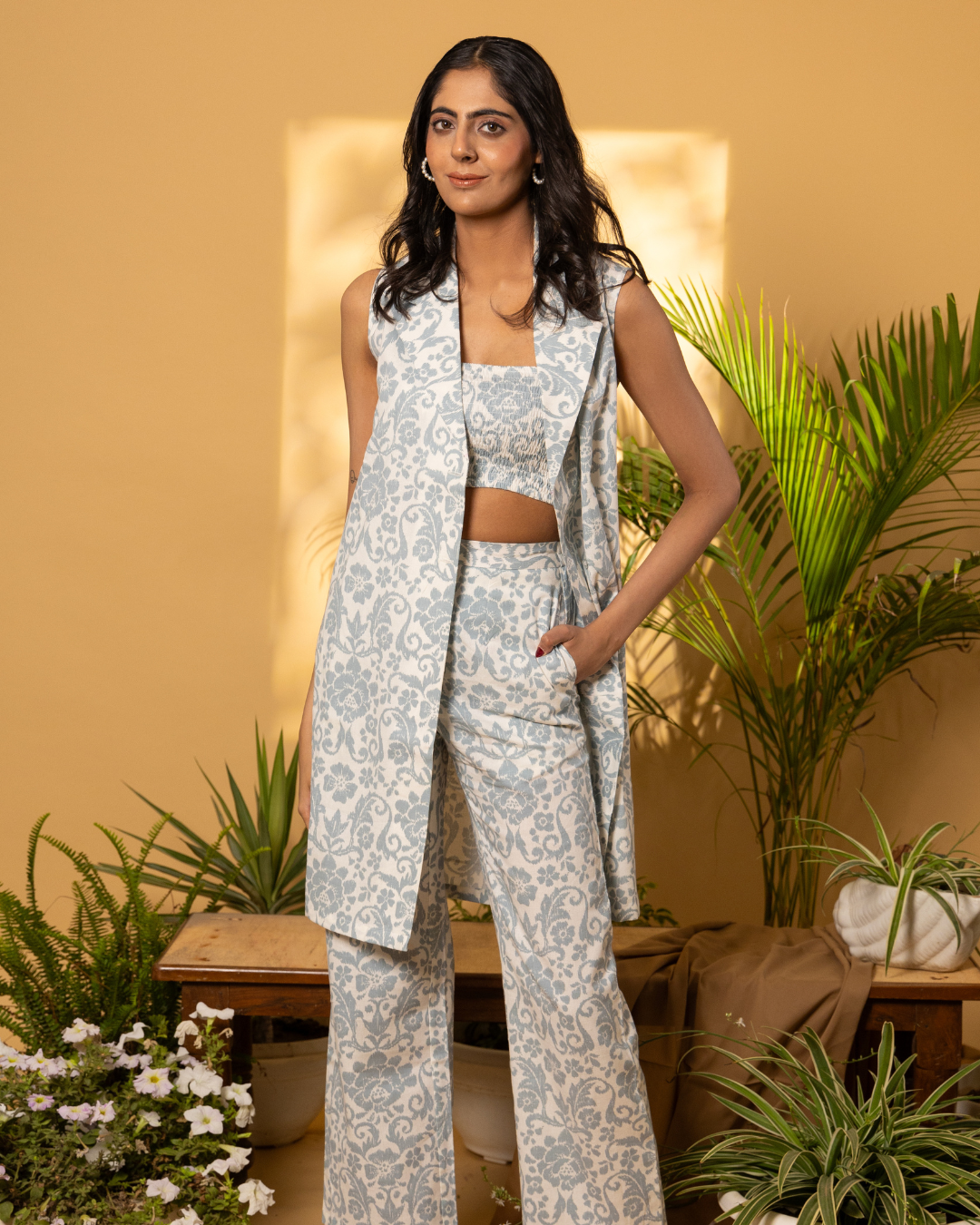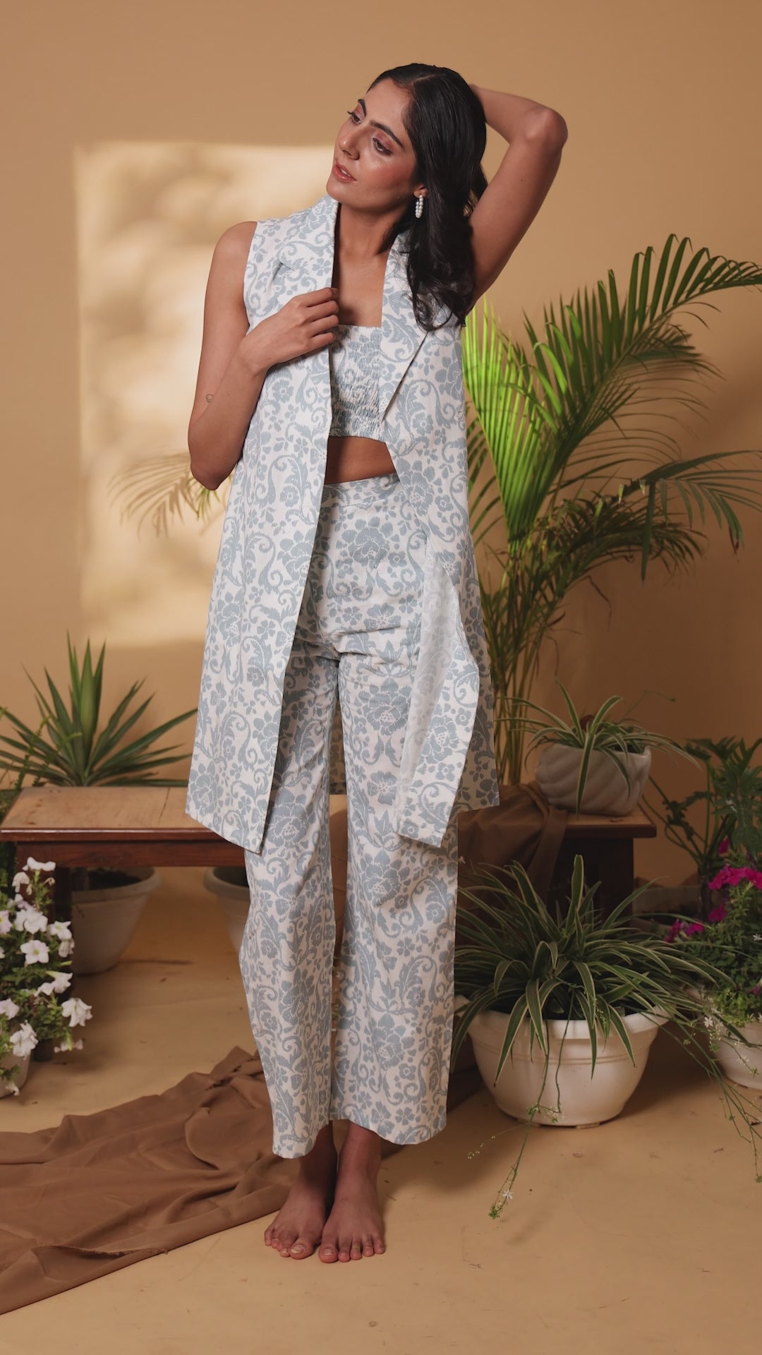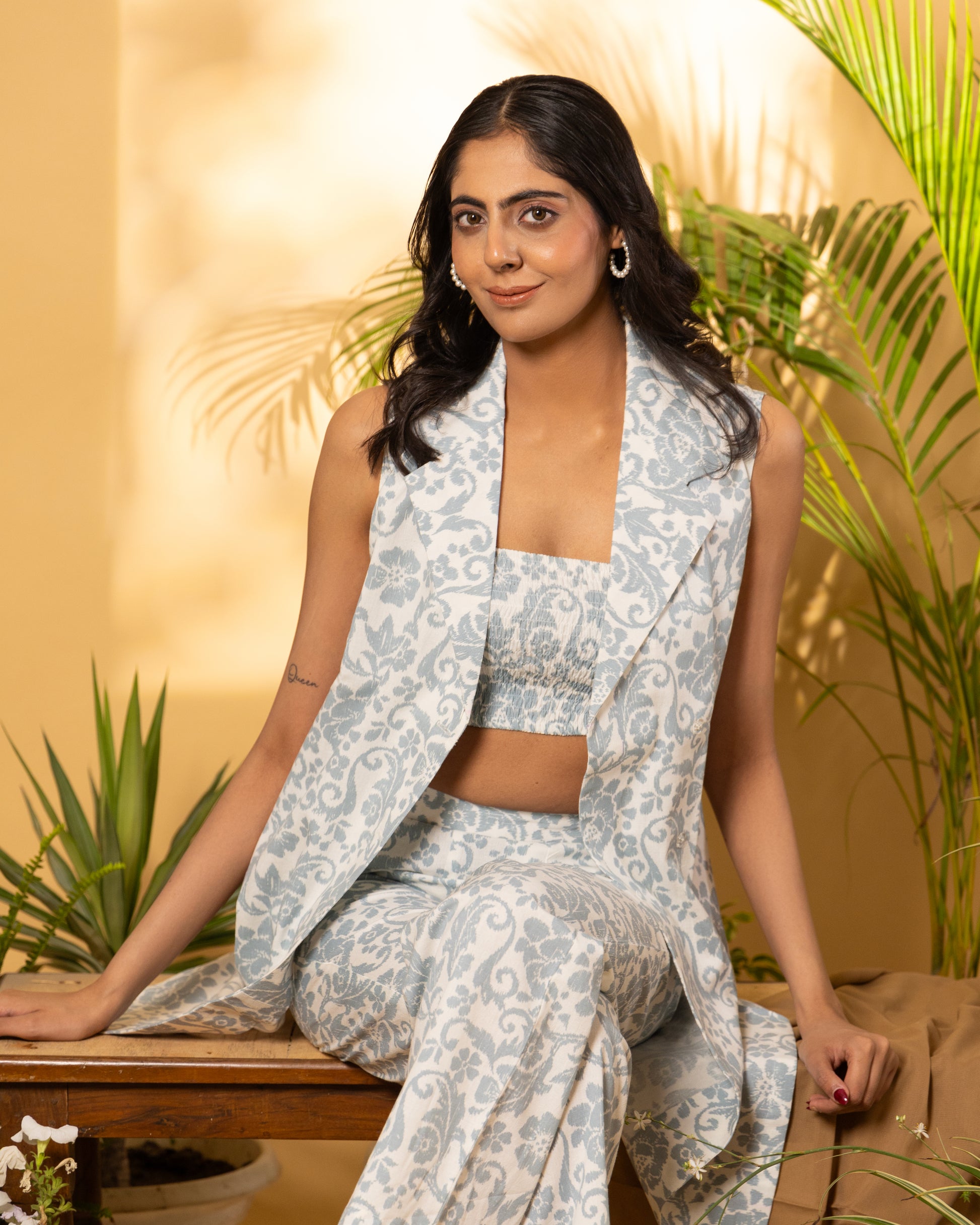 Embrace airy elegance with our Graceful Victorian Linen Set, featuring a white and grey Victorian printed fabric in a sophisticated 3-piece ensemble perfect for summer days and formal events. This semi-formal set includes a sleeveless notch collar jacket, a tube-smocked crop top, and tailored straight pants, offering a versatile and stylish look for any occasion.