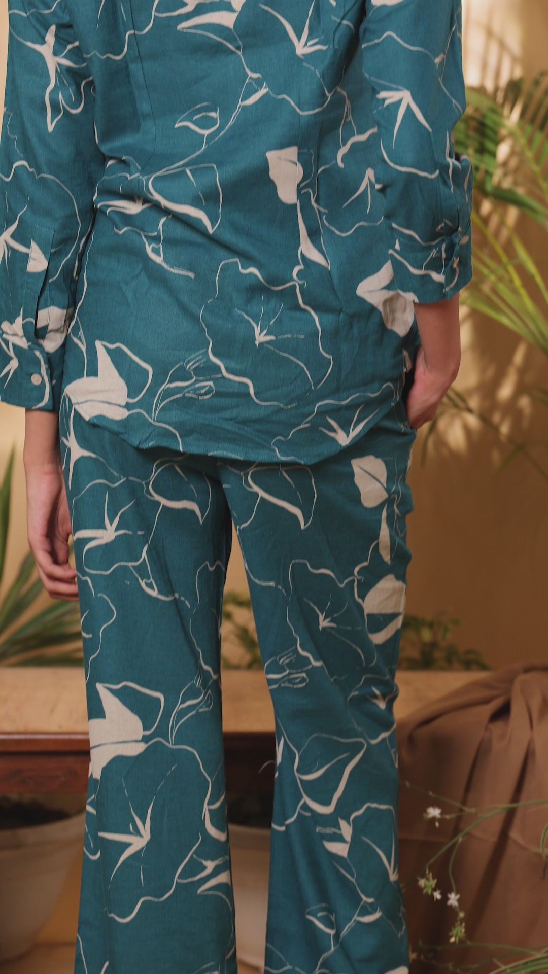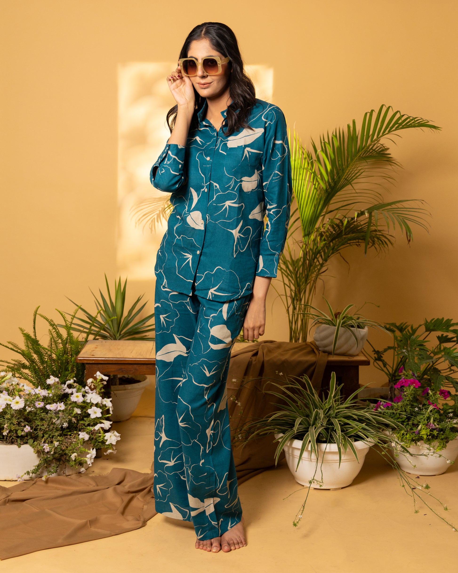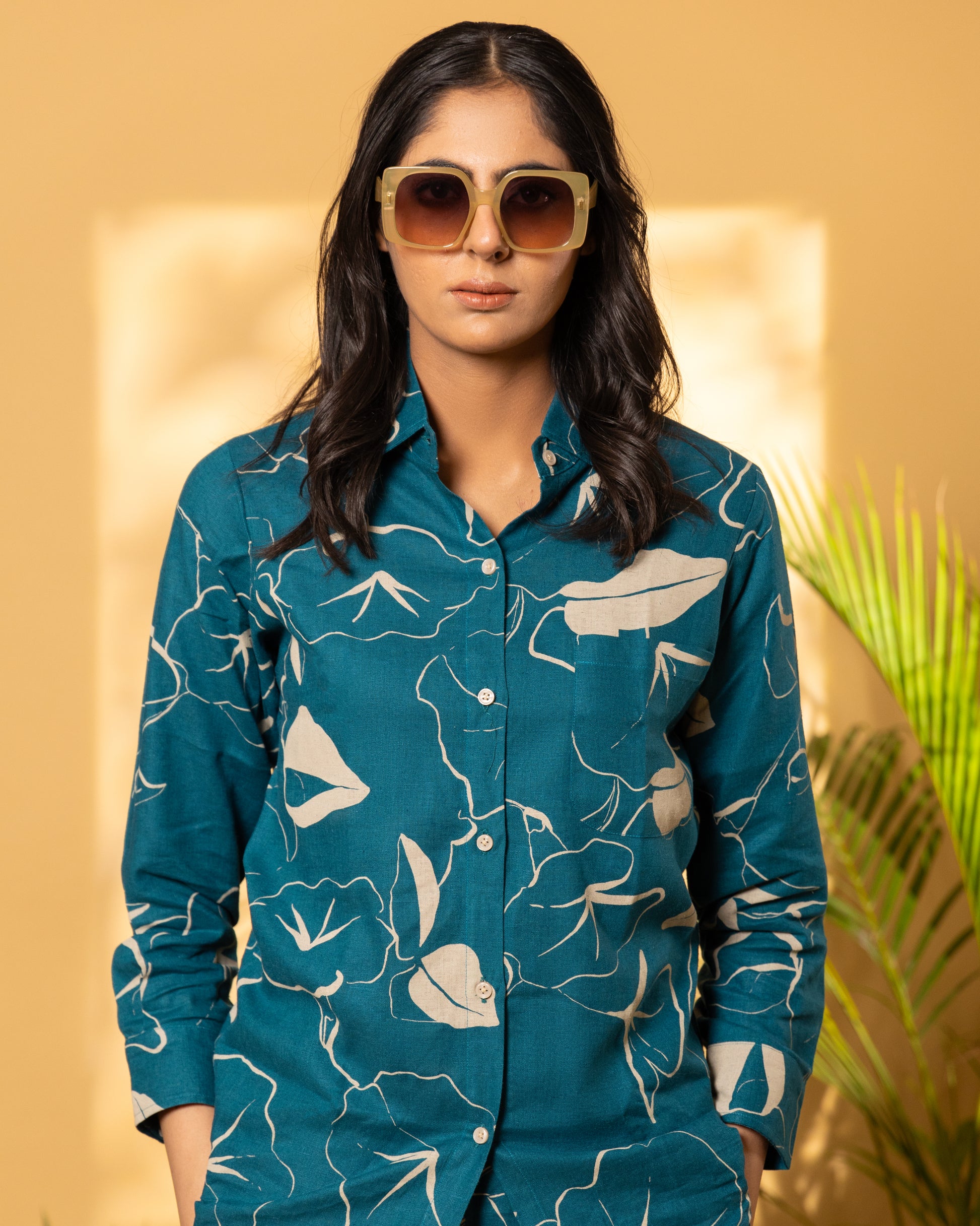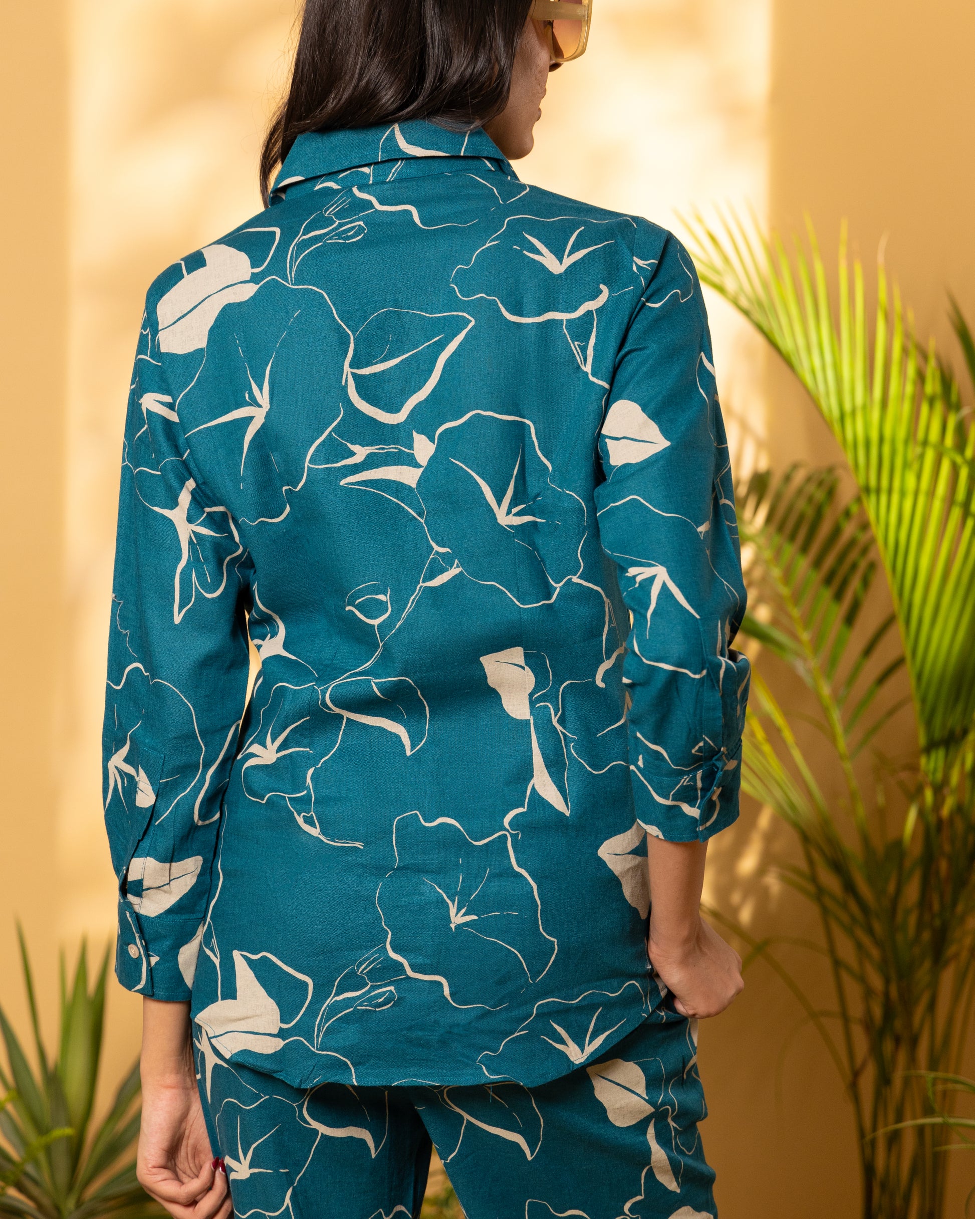 Step into effortless style with our Aurora Linen Coord Set, featuring soft amber printed linen in a rich sherpa blue or deep teal hue. This versatile set includes a classic shirt collar with a patch pocket on the chest and classic cuffs, paired with coordinated straight-legged pants for a relaxed yet sophisticated look. Crafted from breathable linen, this ensemble keeps you cool and comfortable all day long, making it perfect for leisurely days or summer outings.
