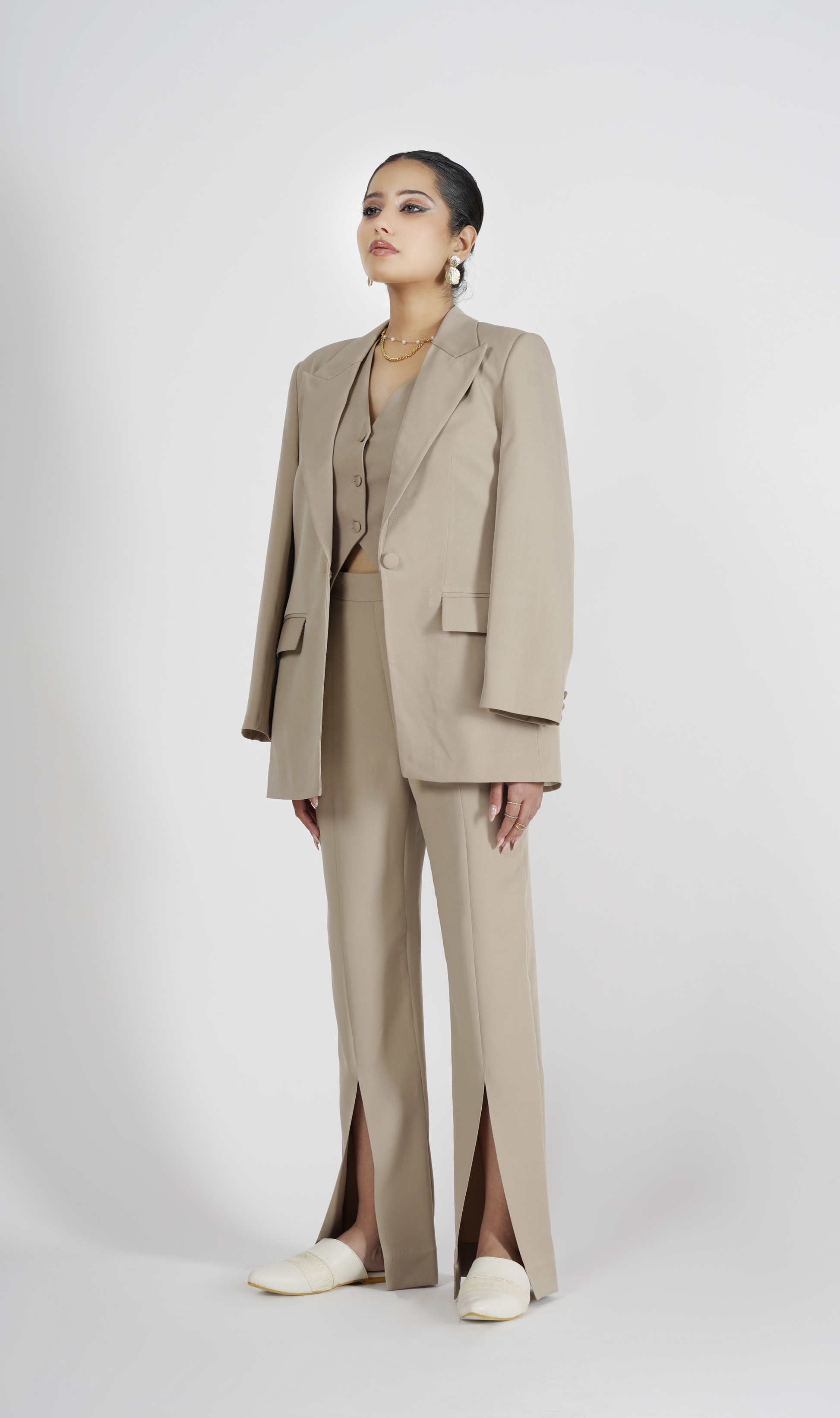 Camel Tri-Piece Peak Collar Powersuit Set With Waistcoat