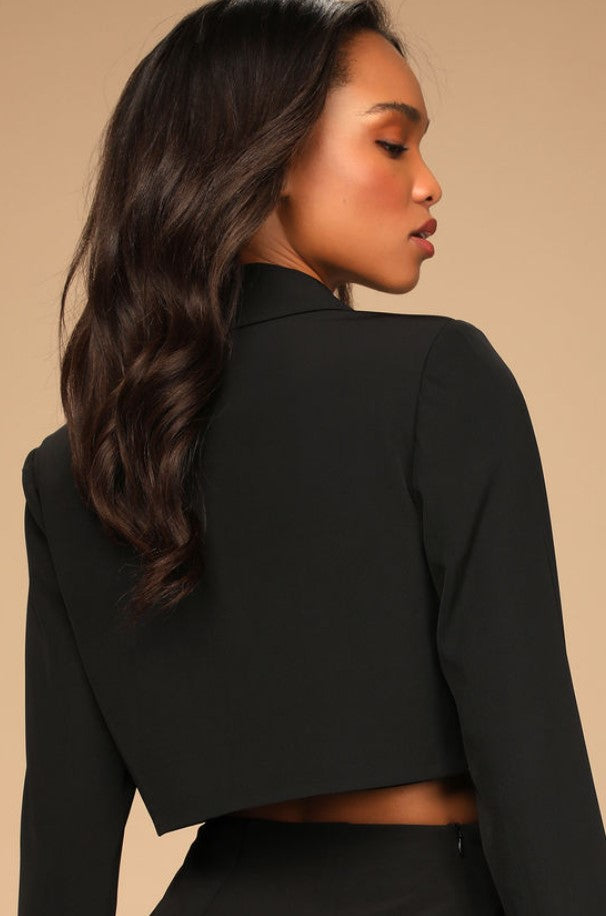 Introducing the exquisite "Elara Double-Breasted Cropped Blazer," a masterpiece crafted from lightweight polyester fabric, radiating sophistication. The regal peak-lapel and row of graceful buttons exude timeless charm, while the discreet hidden internal buttons add practicality. Boasting a decorative welt pocket and padded shoulders, this jacket epitomizes understated luxury.