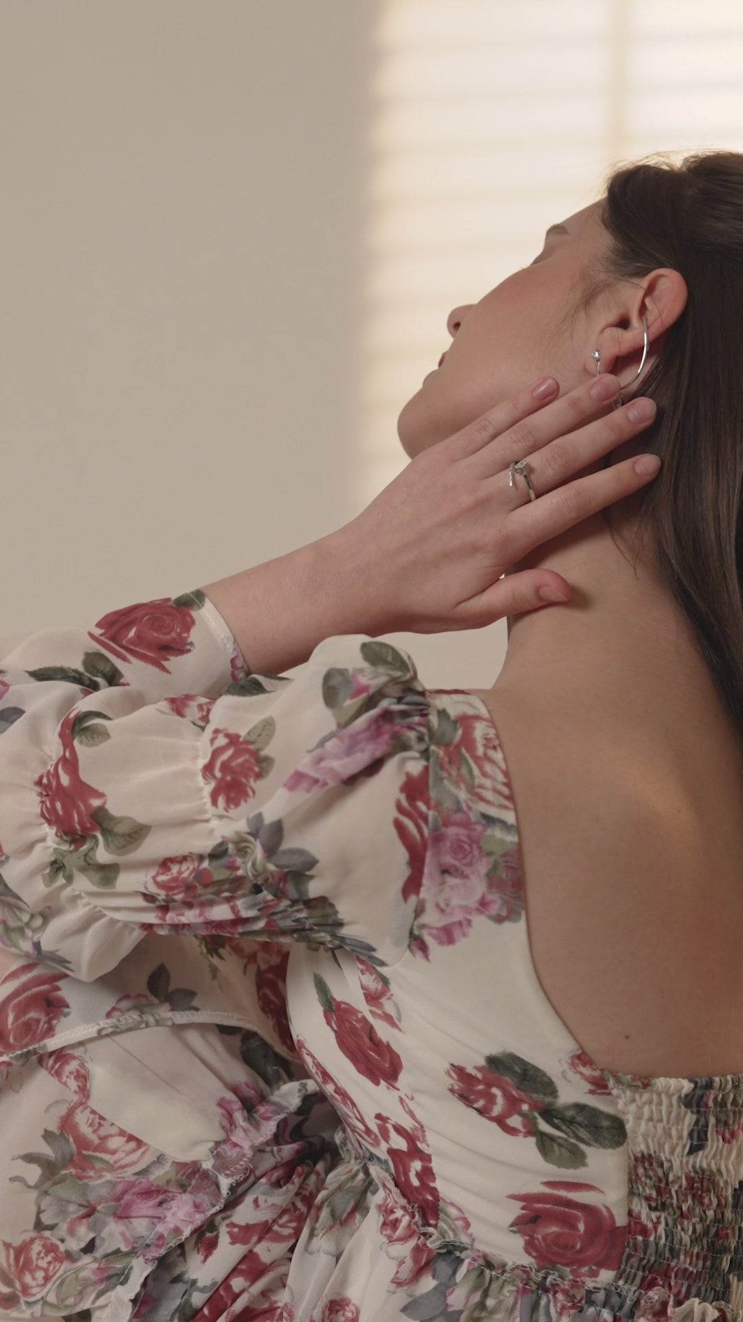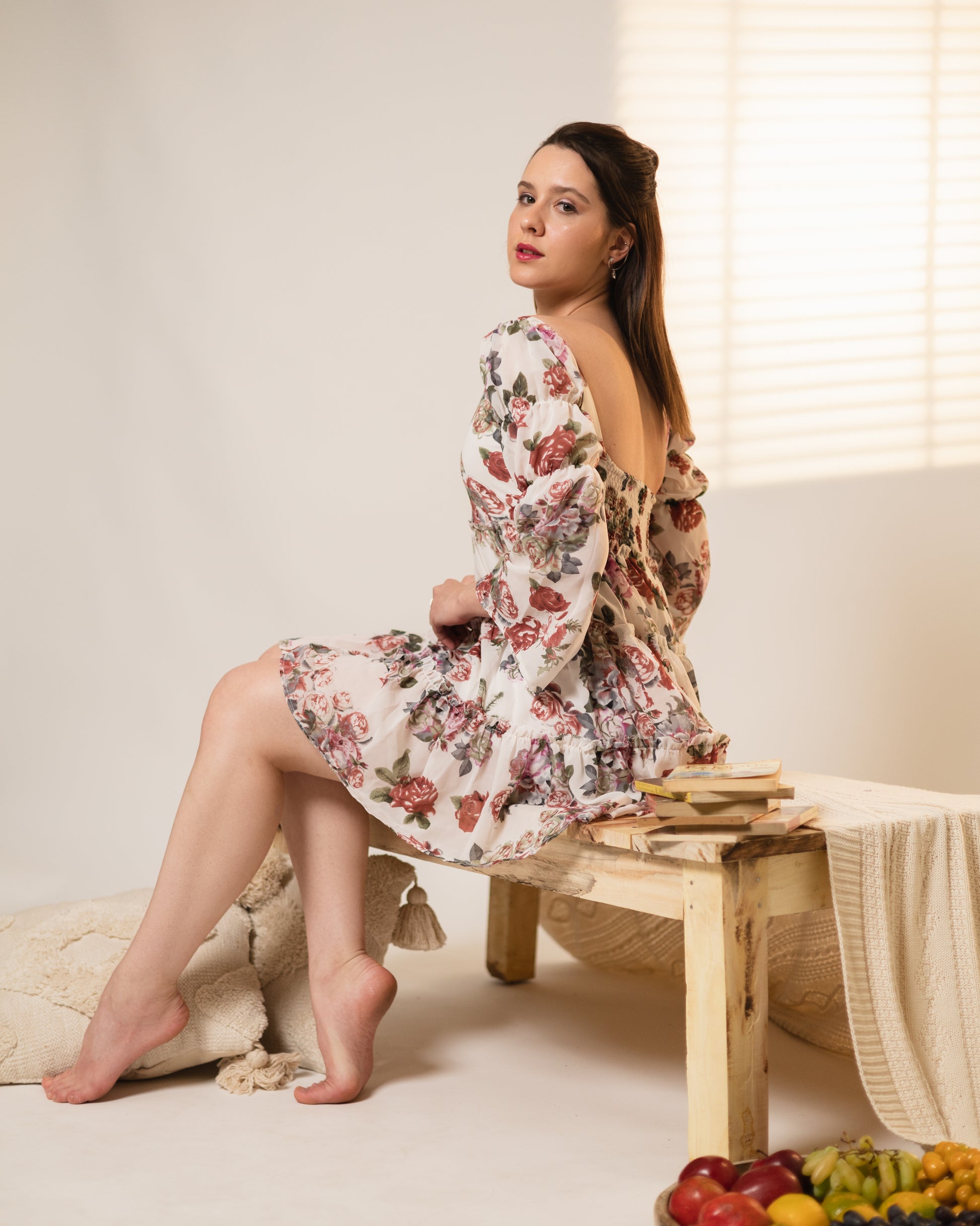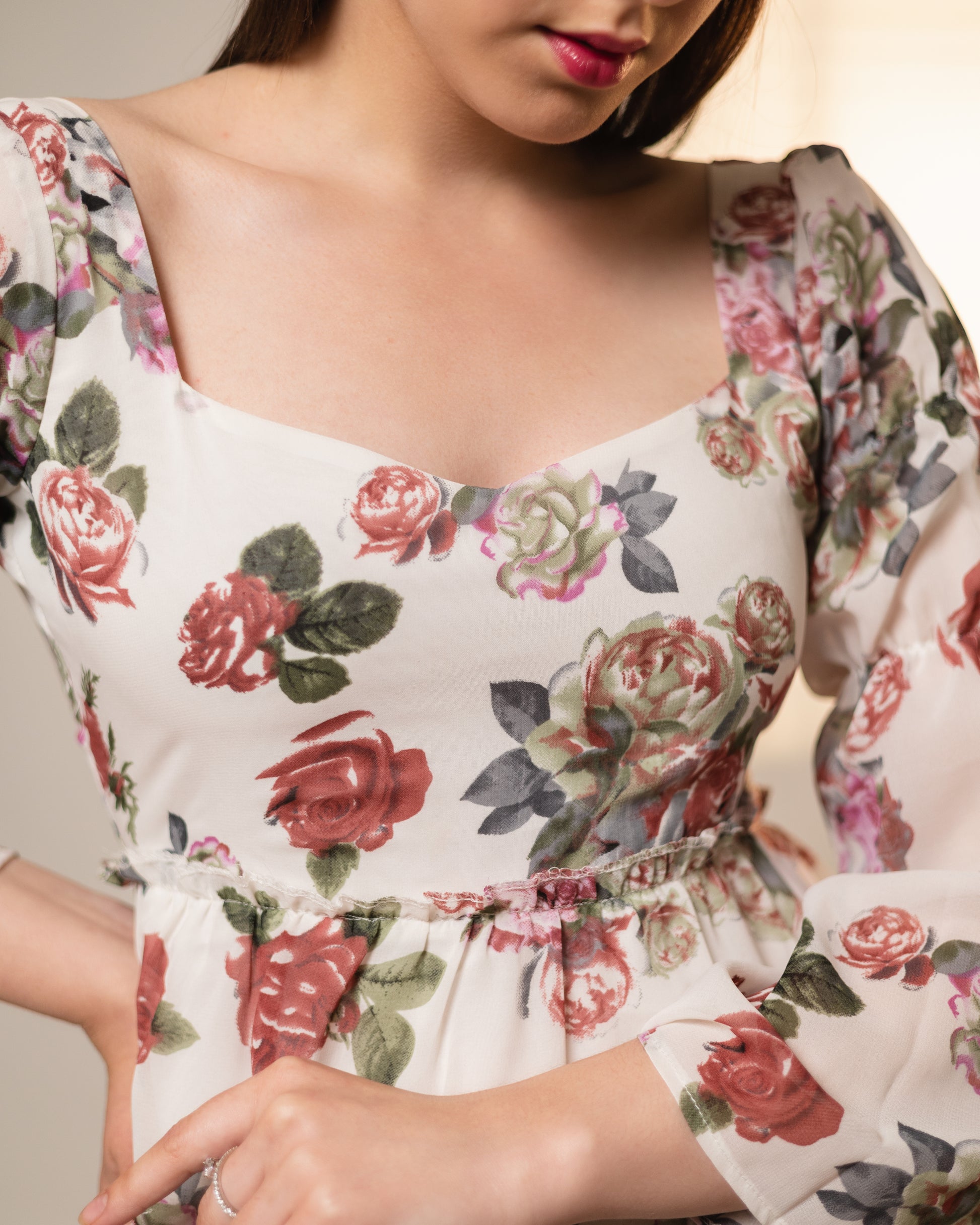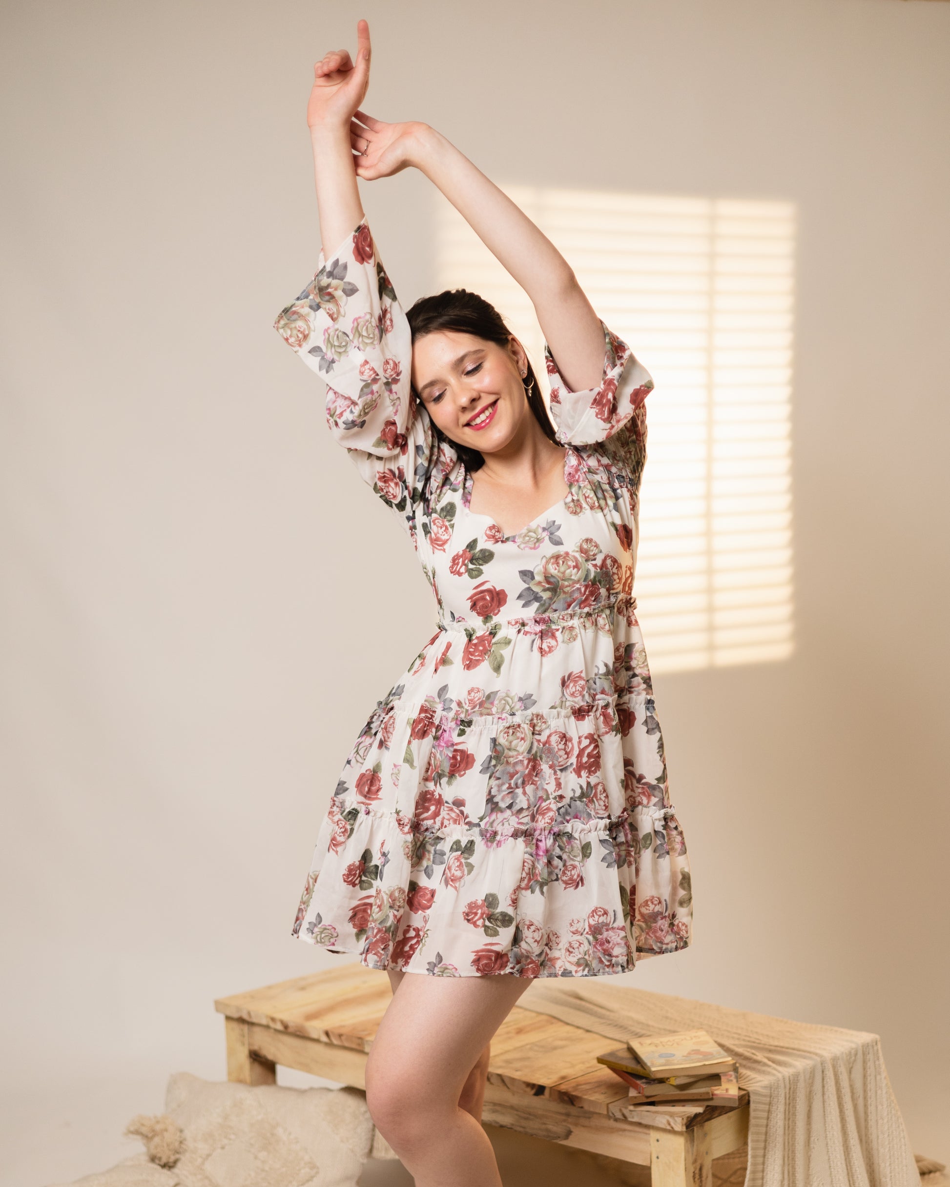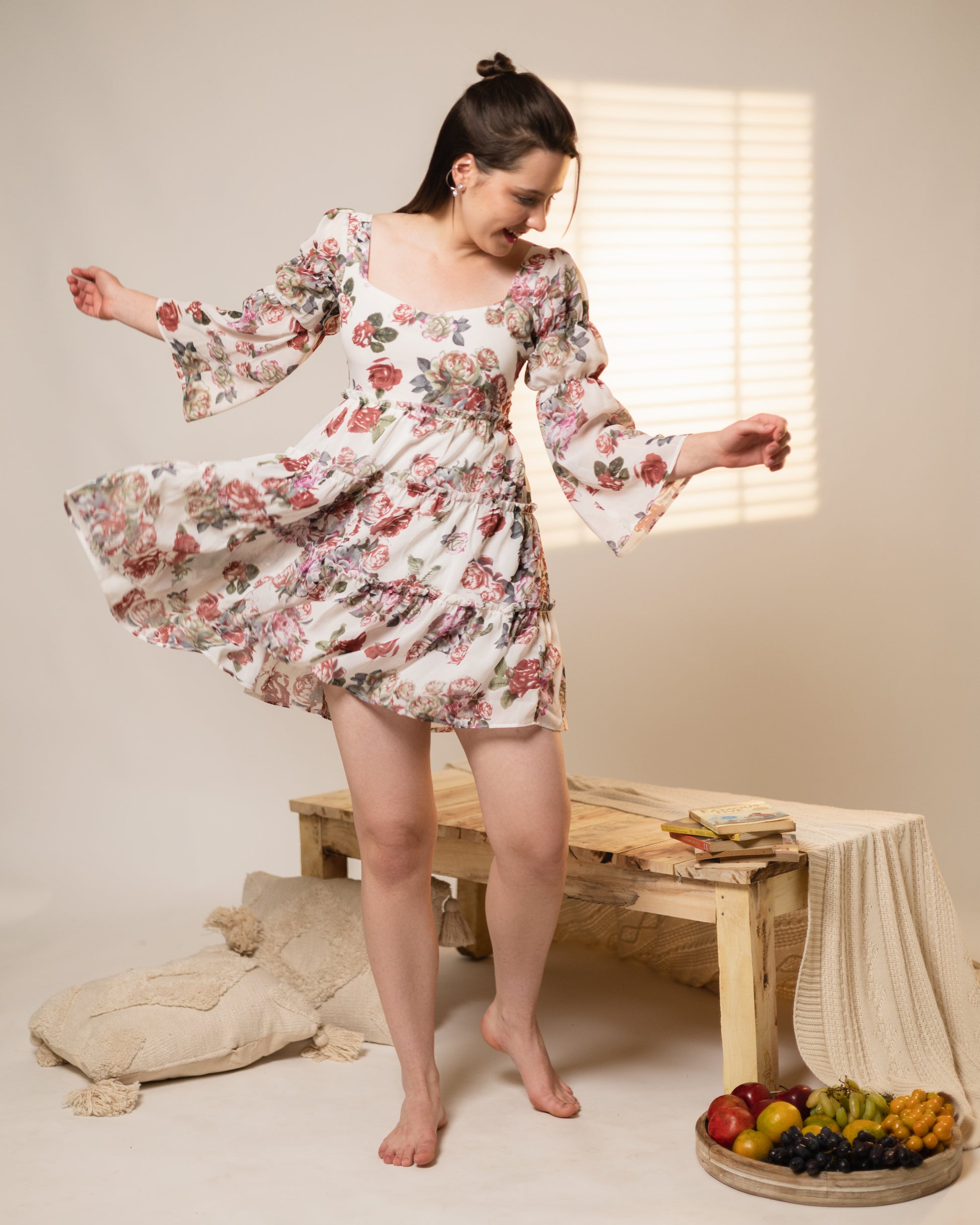 This dress features a playful ruffle design that adds a touch of whimsy to any outfit. The dress is made with high-quality fabric that's both lightweight and breathable, making it perfect for any season. The dress has a fitted bodice and a flowy skirt that creates a flattering silhouette and three tier marie sleeves.
