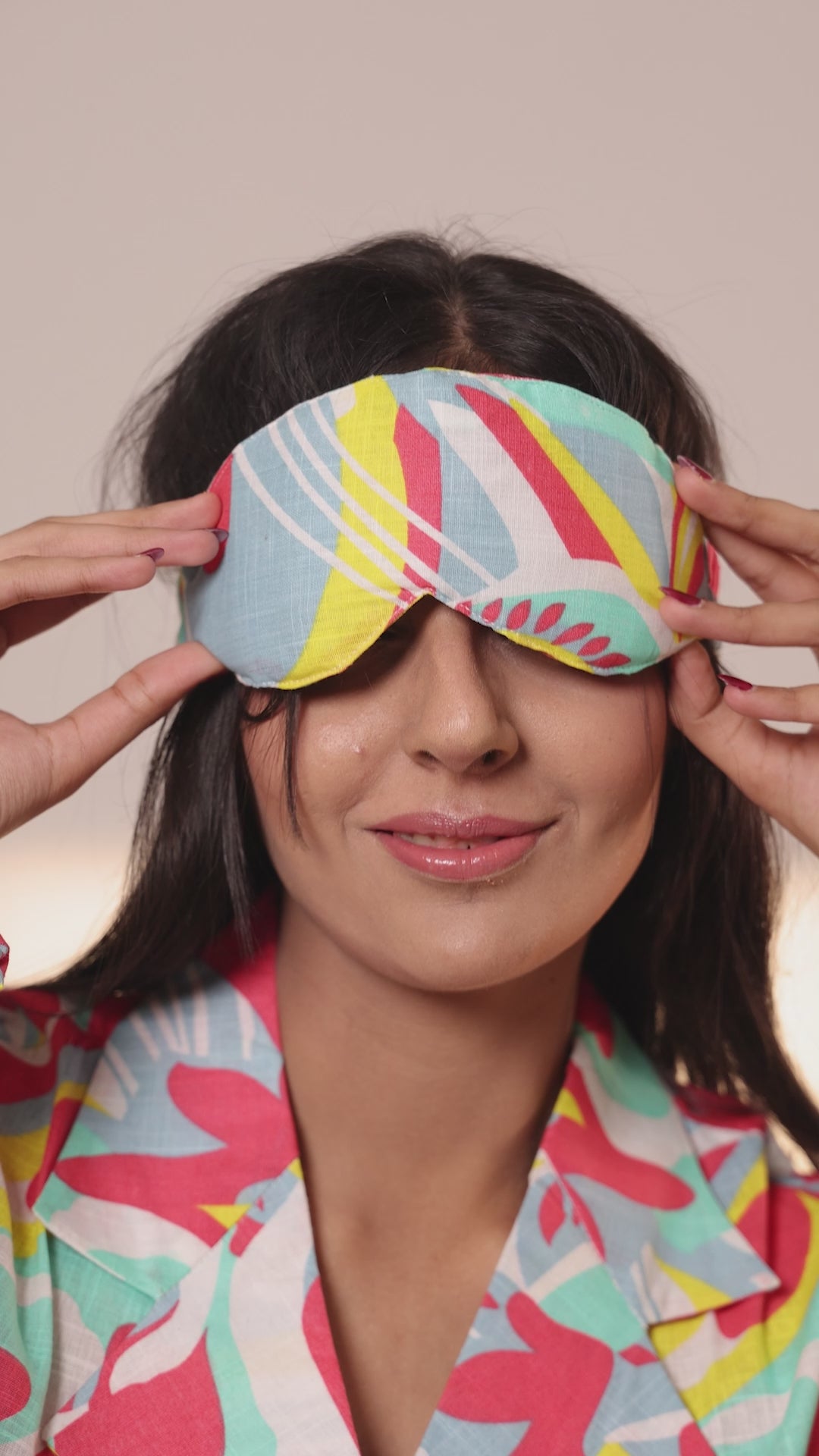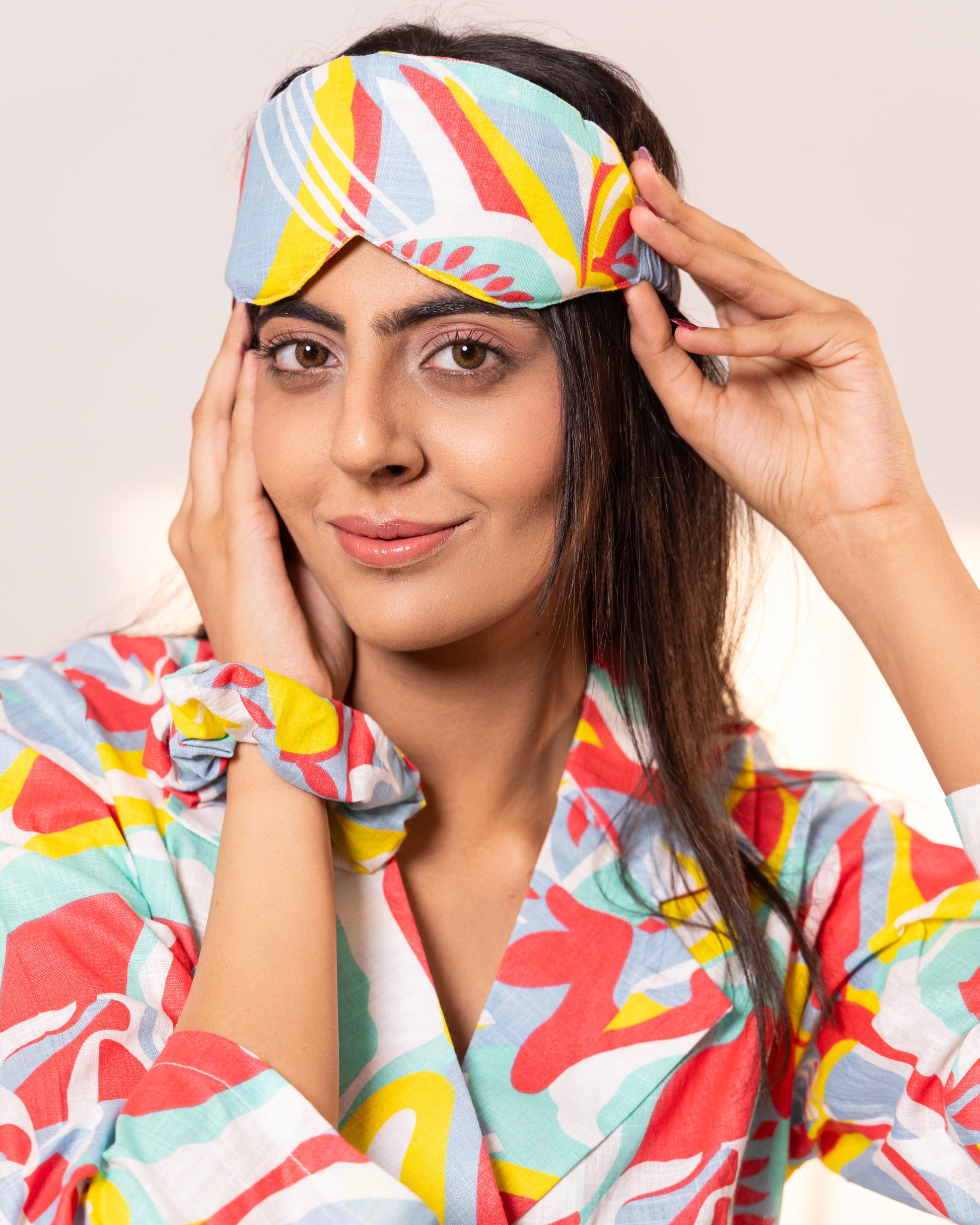 3. 3- piece complete set: Complete the look with our matching scrunchie, eye mask, and headband, exclusively included in the complete 3-piece set (shirt, pajamas, and shorts).