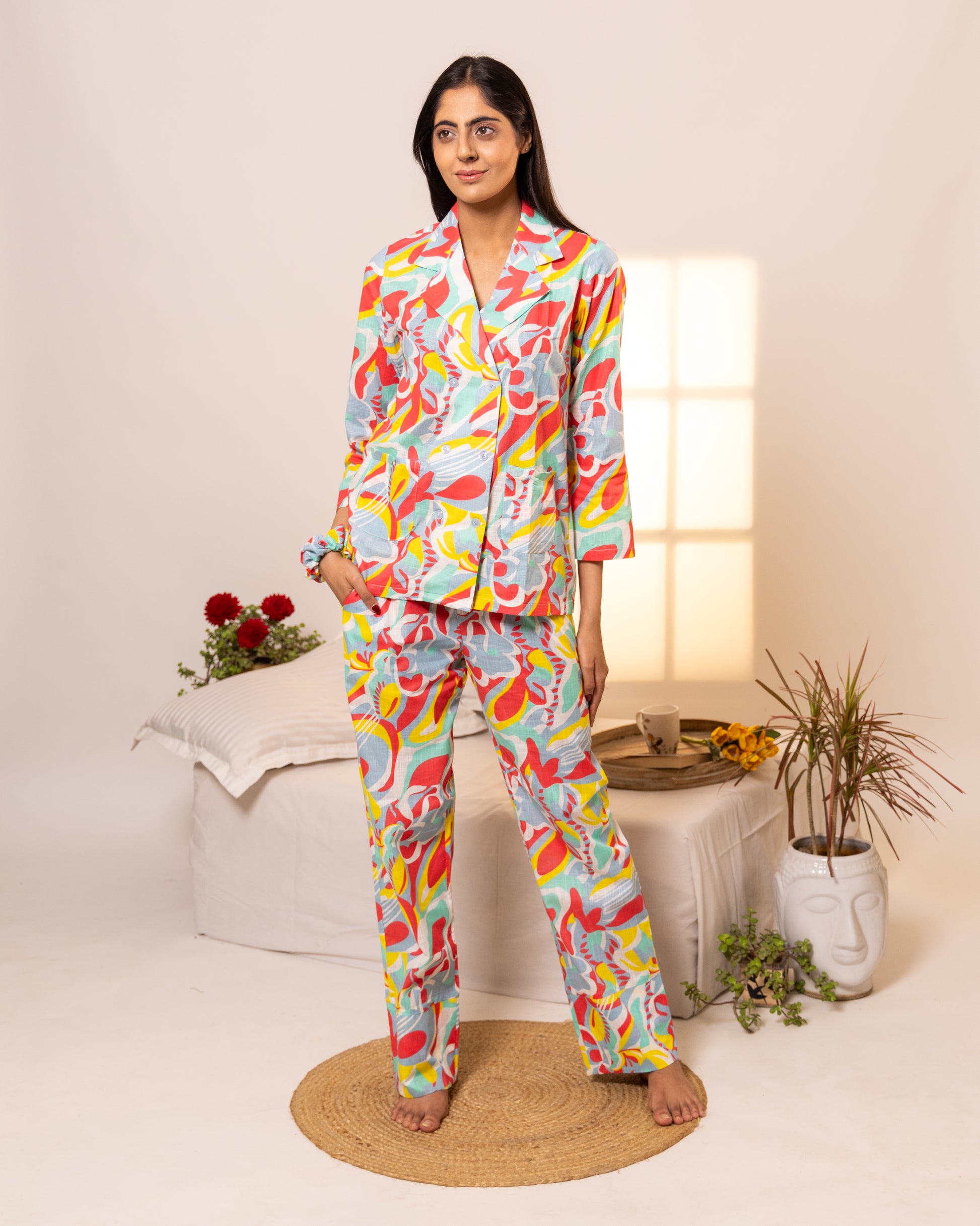 Discover luxurious comfort with our Nebula Nights Double Breasted Lounge Set. This exquisite and unmatched ensemble features a shirt with a sophisticated double-breasted closure, full sleeves, and a classic notch lapel, adorned in a captivating abstract print of greyish-blue tones with vibrant pops of yellow and red.