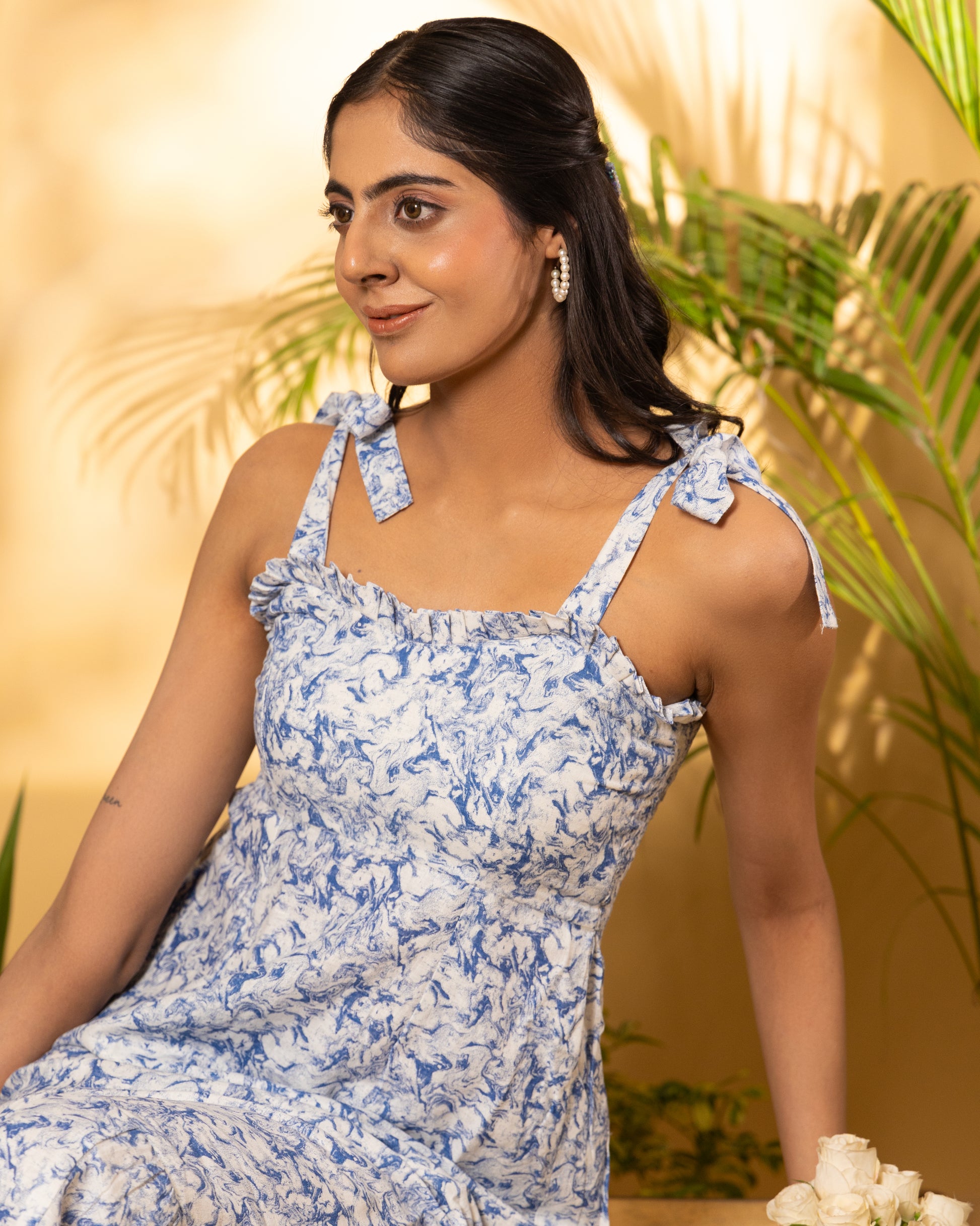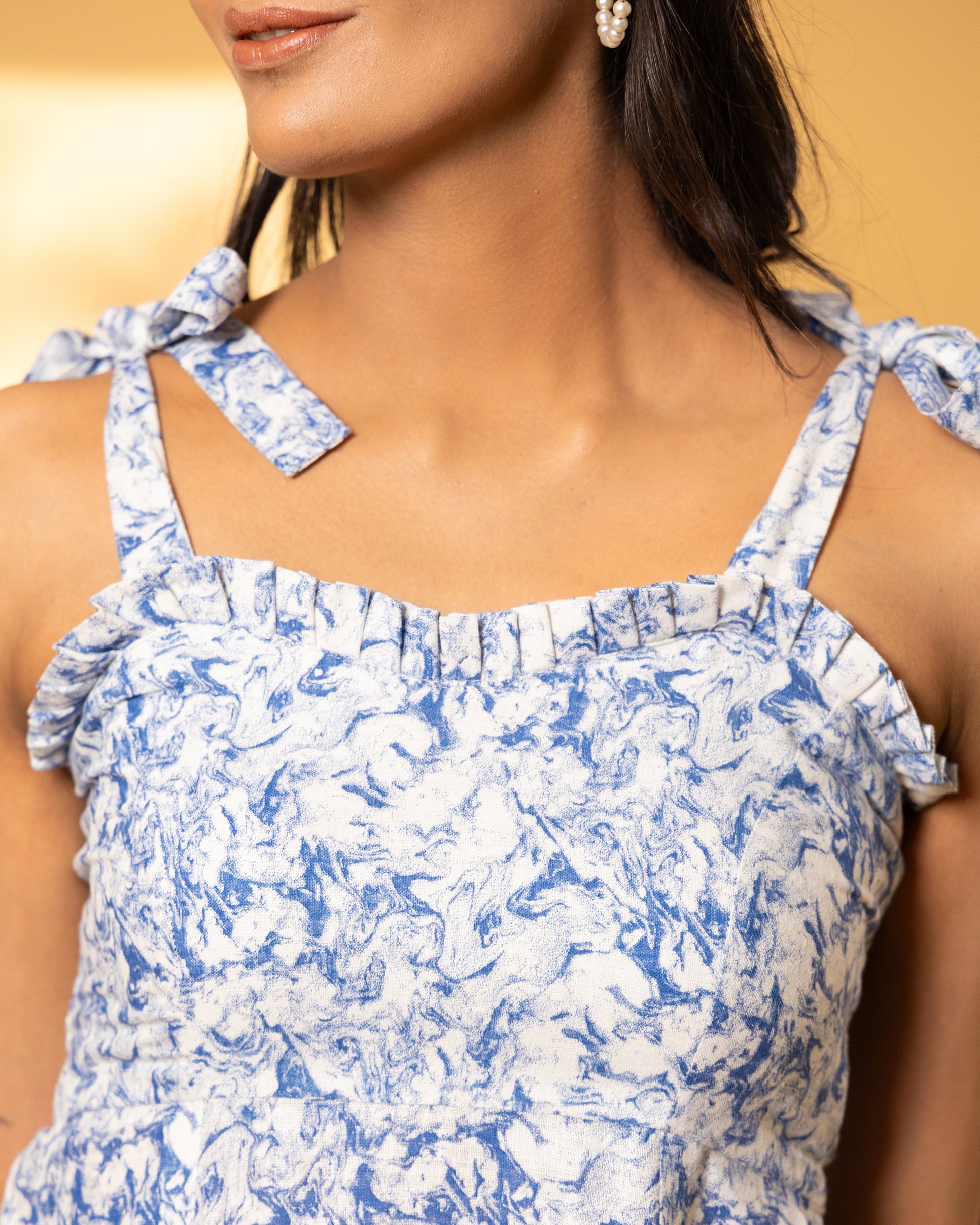 Embrace coastal elegance with our Nerissa Blue Linen Maxi Dress, a captivating piece designed for summer days and breezy vacations. This calf-length dress features a smocked back for a body-hugging fit on the upper body, adorned with a ruffled sweetheart neckline and sleeveless DIY knot straps. The A-line silhouette in blue and white linen exudes effortless sophistication, making it ideal for warm-weather escapades.