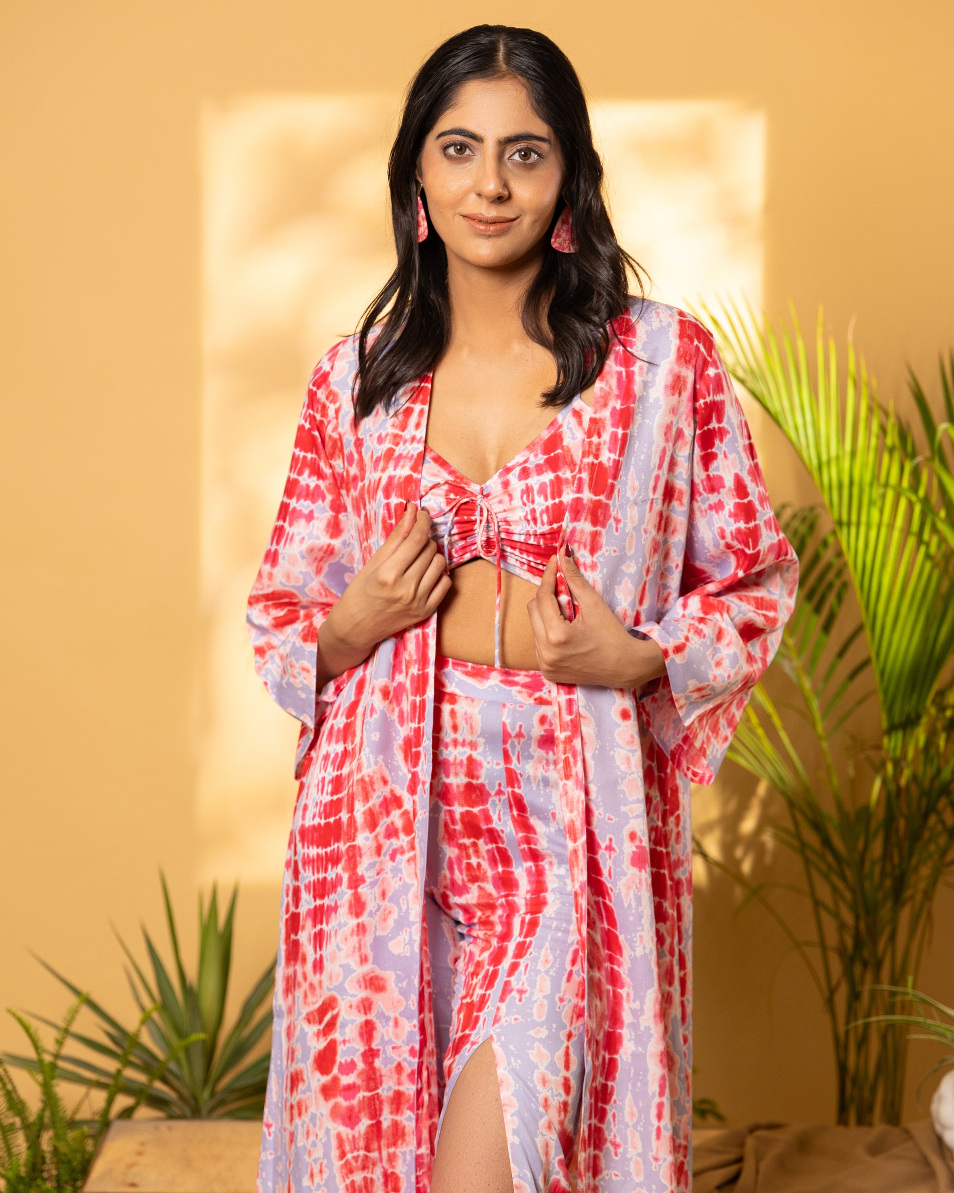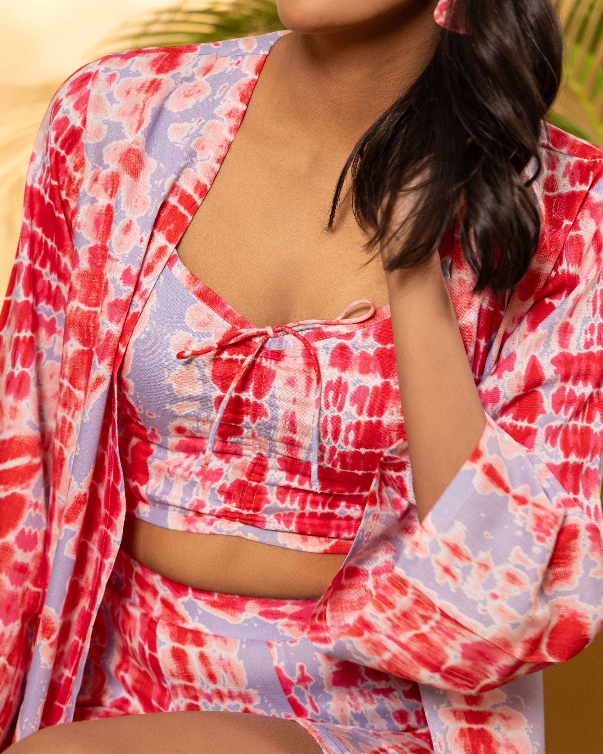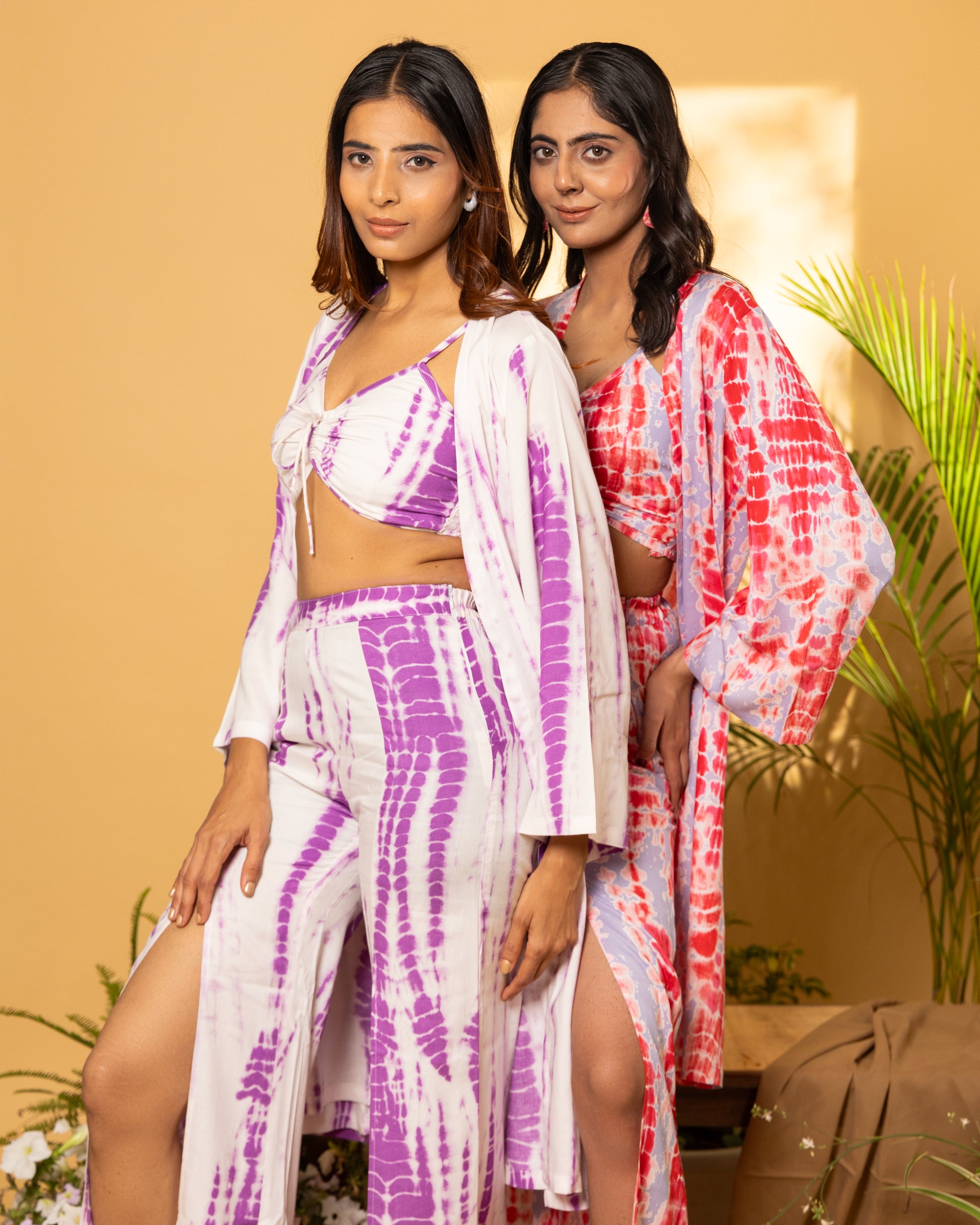 Step into ultimate relaxation and style with our Tranquil Breeze Kimono Set. This 3-piece ensemble features a breezy kimono, slip crop top and versatile bralette DIY, paired with high-waisted flared pants for a vacation-ready look. The midi-length kimono offers a loose and comfortable fit, perfect for lounging by the pool or strolling along the beach. The slip crop top features a shirred back for a body-hugging yet comfortable fit, with drawstrings in the middle that allow you to transform it into a stylish bralette. The high-waisted pants are flowy and flared, complete with a thigh-high front slit for added flair.