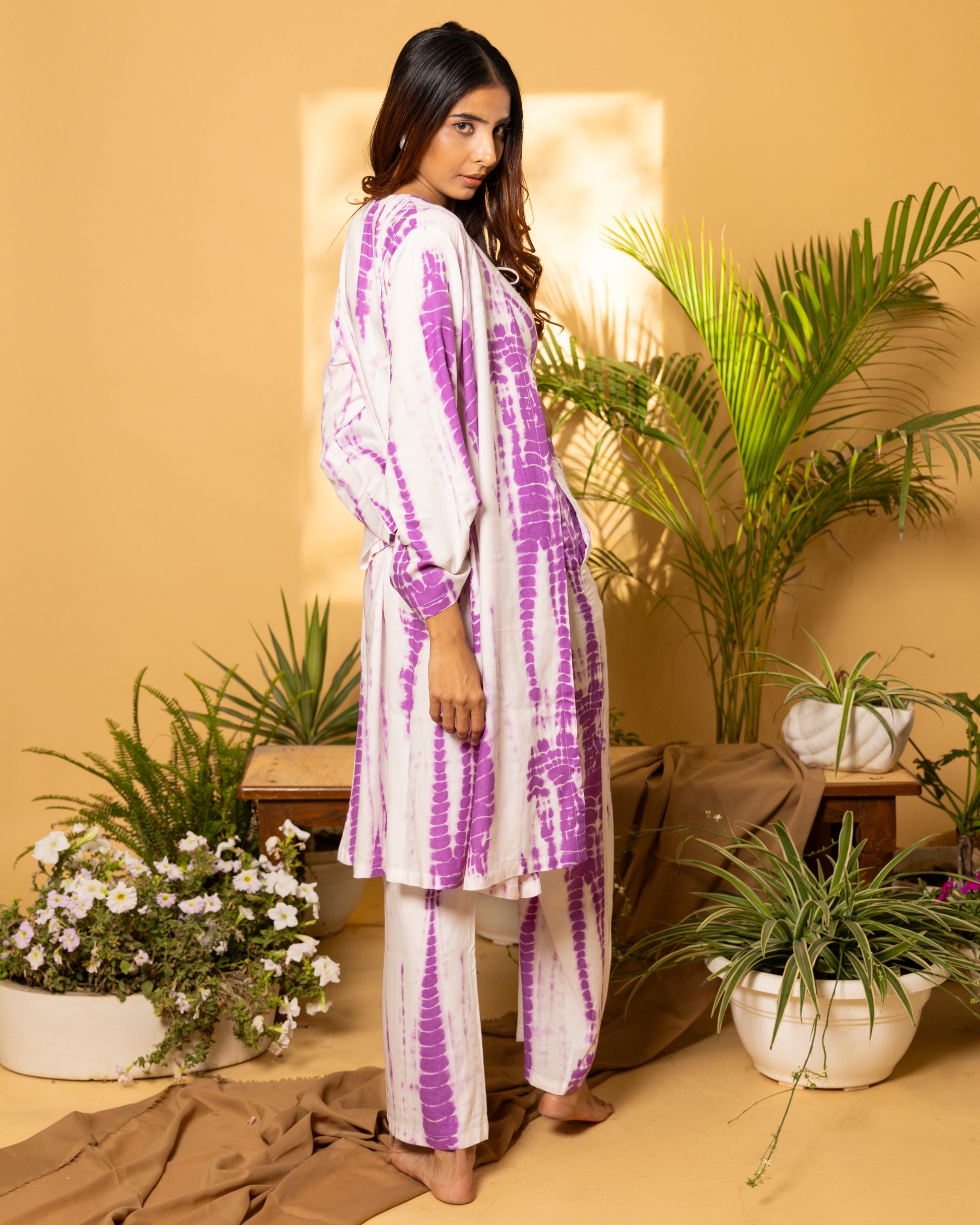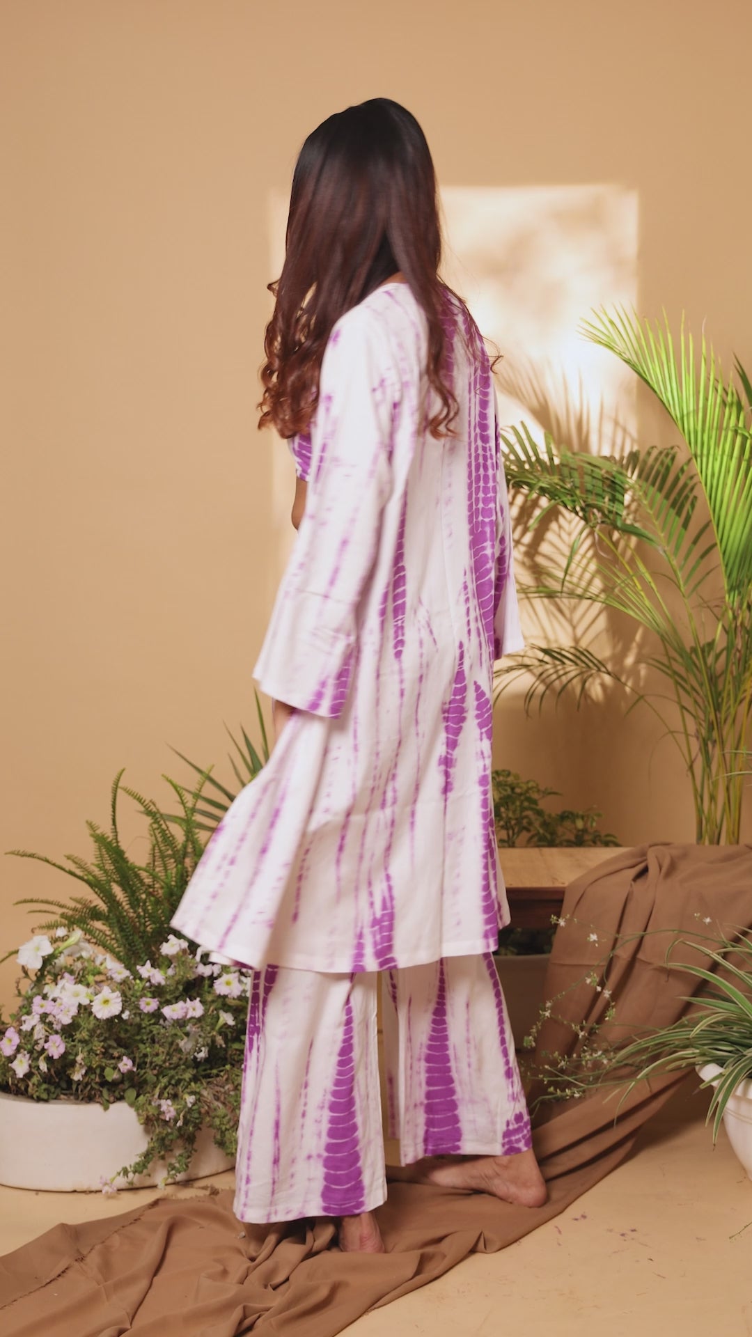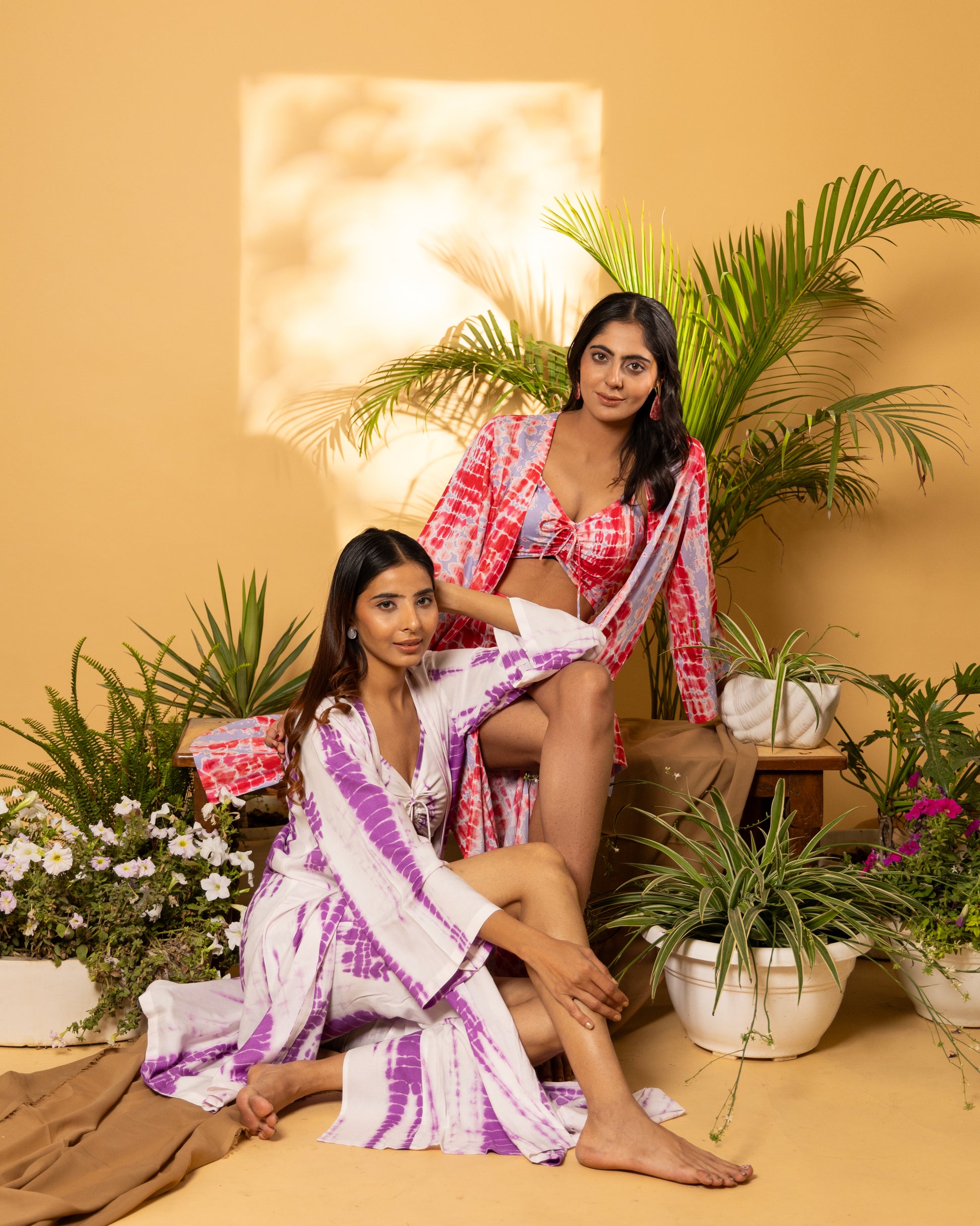Step into ultimate relaxation and style with our Tranquil Breeze Kimono Set. This 3-piece ensemble features a breezy kimono, slip crop top and versatile bralette DIY, paired with high-waisted flared pants for a vacation-ready look. The midi-length kimono offers a loose and comfortable fit, perfect for lounging by the pool or strolling along the beach. The slip crop top features a shirred back for a body-hugging yet comfortable fit, with drawstrings in the middle that allow you to transform it into a stylish bralette. The high-waisted pants are flowy and flared, complete with a thigh-high front slit for added flair.